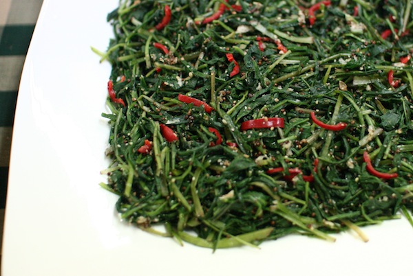 3. 볶은 들깨를 갈아 가루를 내고, 들기름, 된장, 청고추 다진것, 다진 마늘을 넣고 무쳐낸다.